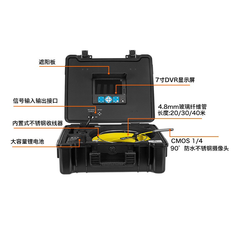 HS6233管道摄像机包含玻璃纤维硬质推杆线缆、线架、高清摄像头、控制器等组成。